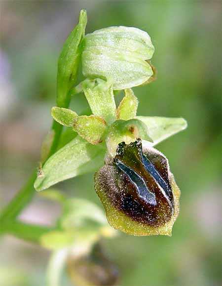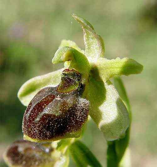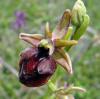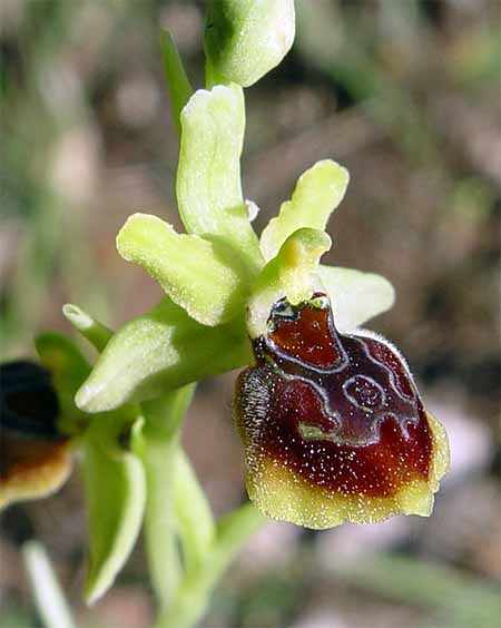 Late flowering time, even in low altitudes, usually entire, round and small lip. Discriminated from O. macedonica by the smaller lip (length 7-10mm vs 10-14mm) and from O. zeusii by the later flowering time and entire lip. In middle and late May, O. epirotica plants can be found still bearing many buds, even in low altitudes, which is not the case in Op. zeusii and negadensis. Nevertheless, this species shows the greatest variability in the group and it is not rare to observe, in the same colony, plants with big and divided lips and this fact creates confusions with O. zeusii and macedonica.