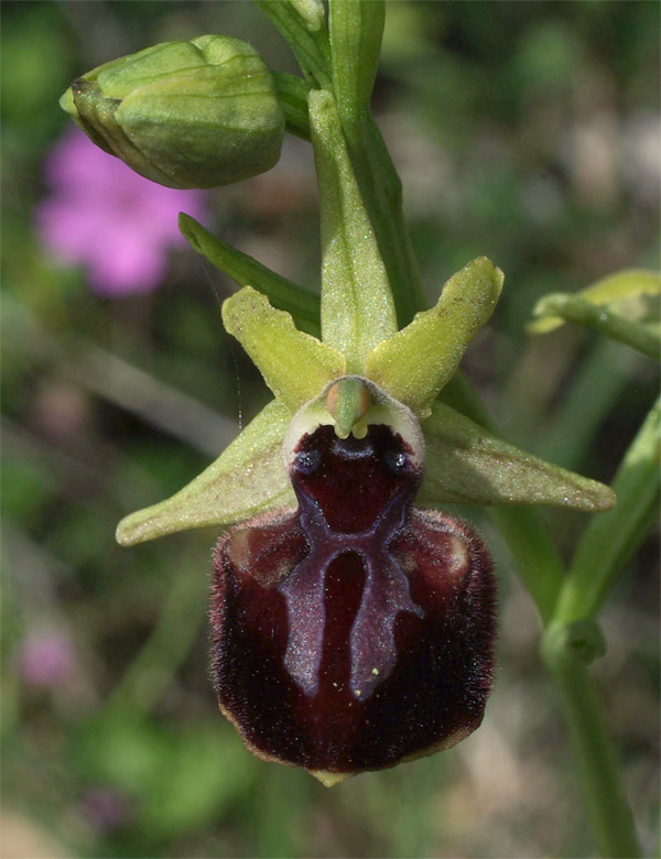 Early Ophrys not flowering after the end of April. Maybe for this reason it was neglected until recently in north-west Greece. In 2007 it was described as an endemic to Albania but apparently exists at the border regions of Epirus, especially at Zagoria. Bicoloured lateral sepals, relatively long petals, small, back-purplish labellum, with a length around 1cm, globular to trapezoid, without the characteristic for Ophrys mammosa, "mammosities" at the lip base, with strong peripheral pilosity which sometimes reminds the Ophrys incubacea of central Mediterranean and a macula design sometimes complex, sometimes in the form of a simple "H". It differs from Ophrys epirotica in the darker flower colors and the much earlier flowering time and from Ophrys mamosa, in the small and hairy labellum.