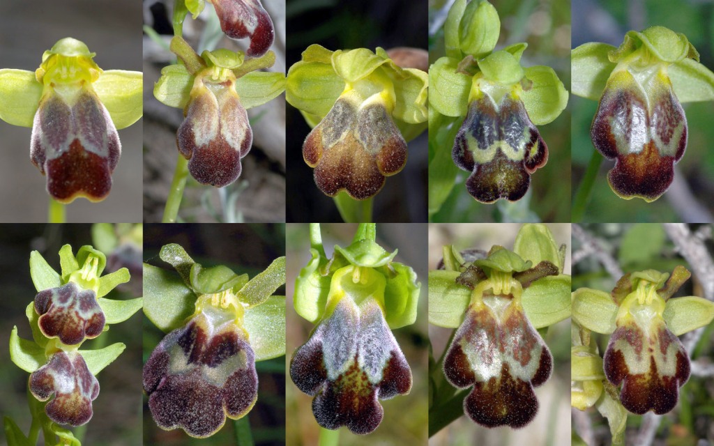 Similar to Ophrys omegaifera in lip dimensions (lip length 16-22mm) and structure (mid lobe is swollen and with an apparent central notch). Contrary to Ophrys omegaifera, lip base bears a deep V-shaped groove reminding Ophrys pelinaea. Lateral lobes are spreading out and the whole lip is bending downwards reminding the Cretan Ophrys creberrima. The speculum is lined by a thick Ω line at the lower limit and at this area there is a characteristic depression on the lip surface which divides central from lateral lobes. Until now, Ophrys meropes grows at Kos and Samos islands (Delforge, Giorgos Phakas). Late flowering time, end March to mid April. Distribution map