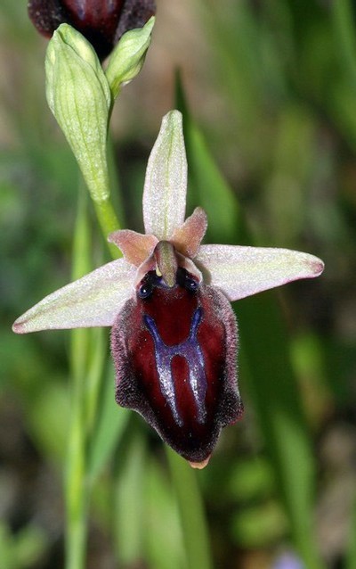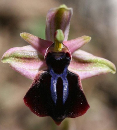 Ophrys mammosa subsp. falsomammosa B.Baumann & H.Baumann, 2005 Description: Ophrys doerfleri was described in the year 1925 by the German botanist H. Fleischmann. He found the plant on the little island Gavdos (near Crete) and the following years it was erroneously postulated that Fleischmann's discovery concerned Ophrys ariadne or Ophrys cretica. Dr Horst Kretzschmar and Ralf Jahn were the first to realize that the Ophrys mammosa from Crete were different than the rest from other areas of Greece. After this, Helmut Presser, in one of his recent articles (Jour. Eur. Orch. 38: 501 – 518. 2006), showed that Fleischmann's reference concerned these particular plants, that until now were classified as Ophrys mammosa from Crete, and not Ophrys cretica or Ophrys ariadnae. Indeed, Ophrys mammosa is an early flowering plant, while Ophrys doerfleri is rather late and it is a little smaller in all parts. There are also other differences in the flowers: Most of the Ophrys doerfleri individuals show another shape of the labellum which is "pinched" in the lower part, reminding a bird's beak. About 20% to 30% show petals and sepals coloured, often pure pink what you can see never or extremly rare at Ophrys mammosa. The connective is always clearly longer than Ophrys mammosa's. It seems that Ophrys doerfleri is related to Ophrys morio (transhyrcana). Some plants remind Ophrys spruneri with entire lip, due to the colored perigon and the wide lib base.
