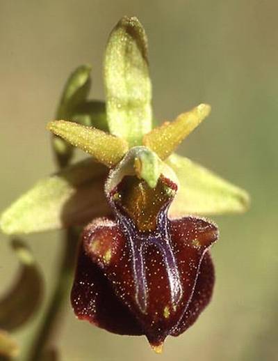 a generally lighter – brownish lip color. Its lip is much smaller. Ophrys
