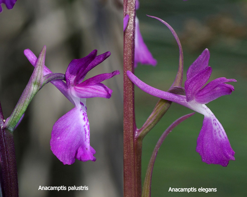 Κατανομή: Η Anacamptis palustris παρουσιάζει ευρεία μεσο-ευρωπαϊκή εξάπλωση, στην Ισπανία Γαλλία, Γερμανία με επέκταση σε πολλές Μεσογειακές χώρες. Δια μέσω της Ιταλίας φτάνει στην Ελλάδα αποικίζοντας τα Ιόνια, την Ήπειρο και περιοχές της δυτικής Πελοποννήσου. Στα Βαλκάνια και ανατολική Ελλάδα φαίνεται να αντικαθιστάται σταδιακά από την Anacamptis elegans. Περιγραφή: Φυτό λεπτό, ύψους 35-70 cm. Φύλλα λογχοειδή λεπτά και μακριά, το ανώτερο μέχρι 7 εκ. Η ταξιανθία συνήθως αραιή με μέσο μήκος περί τα 15 εκ. Τα άνθη συνήθως ανοιχτόχρωμα ιώδη αλλά με ποικίλο χρωματισμό ως και σκούρα ιώδη. Χείλος έντονα τρίλοβο με τους πλευρικούς λοβούς επίπεδους και μερικές φορές με ανερχόμενα κράσπεδα. Ο μεσαίος λοβός εμφανίζει εγκοπή στην κορυφή και έχει ανοιχτόχρωμη βασική περιοχή με συνήθως έντονη στίξη. Βράκτια σχεδόν με ίδιο μήκος με την ωοθήκη. Πλήκτρο οριζόντιο ή ελαφρά ανερχόμενο Η Αnacamptis palustris σε σχέση με την Anacamptis elegans εμφανίζει πιο ανοιχτόχρωμα άνθη, έντονα τρίλοβα και σχετικά επίπεδα. Τα βράκτια είναι σαφώς μικρότερα. Το φυτό και η ταξιανθία της An. palustris είναι συνήθως μικρότερα. Παραστατικά οι διαφορές, στις εικόνες μετά το αγγλικό κείμενο. Βιότοπος: Υφάλμυροι παραθαλάσσιοι υγρότοποι είναι οι τυπικές θέσεις που μπορεί κάποιος να βρει Anacamptis palustris. Φυτό που αντέχει σε ψηλές συγκεντρώσεις αλατιού και αλκαλικά εδάφη, αποκλειστικά σε ηλιόλουστα μέρη. Εποχή άνθησης: Αρχές Μαΐου - αρχές Ιουνίου. Distribution: Anacamptis palustris shows wide spread mid-European distribution, at Spain, France, Germany, with expansion in many Mediterranean countries. Through Italy, it colonizes Ionian islands, Epirus' coastal areas and some locations on western Peloponnese. In the Balkans and eastern Greece seems to be gradually replaced by Anacamptis elegans. Description: Thin plant with height of 35-70 cm. Habitat: Salty coastal wetlands are the typical habitats preferred by Anacamptis palustris. Plant that can withstand high salt concentrations and alkaline soils, almost always in sunny places. Flowering time: Early May - mid June.