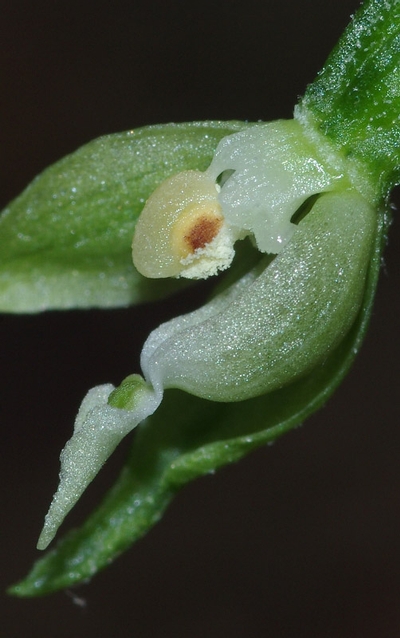 Περιγραφή: Είδος που βρέθηκε πρόσφατα στην Ελλάδα (Τσιφτσής 2009) και συγκεκριμένα στη Ροδόπη. Χαρακτηρίζεται από τα μαλακά, σκούρα πράσινα, λογχοειδή, σε ± σπειροειδή διάταξη φύλλα. Τα άνθη του είναι πρασινωπά, χωρίς αποχρώσεις, αυτεπικονιαζόμενα, πολλές φορές κλειστόγαμα. Το επιχείλιο είναι λευκωπό, με πρασινωπό κέντρο και δύο πολύ ελαφρά ωχροπράσινα εξογκώματα στη βάση, ενώ η ένωσή του με το υποχείλιο είναι στενή. Ανθικός ποδίσκος βραχύς, με ελαφρά ιώδεις αποχρώσεις στη βάση του. Τα φυτά του Ολύμπου αποκλίνουν της περιγραφής, έχοντας πιο οξύαιχμο και μακρύτερο επιχείλιο, ρηχό και επίμηκες υποχείλιο και μεγαλύτερα σέπαλα. Τα φύλλα τους έχουν κυματιστή παρυφή και είναι μεγαλύτερα. Επίσης φύονται σε δάσος ελάτης και ίσως η απόκλιση να αποτελεί οικοτυπική προσαρμογή του είδους μοναδική στην Ευρώπη.