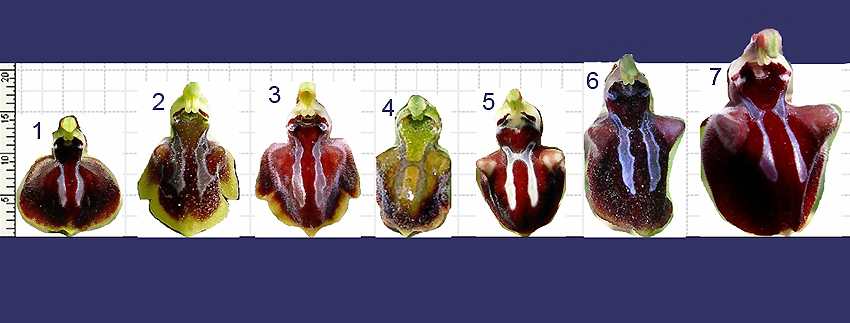 The white pseudoeyes, especially at their external surface and the white stripe on the floor of the stigmatic cavity are the most useful keys of recognition, but sometimes it mixes with related species and transitional forms are making the identification difficult. In the table, for example, you can see plants which are affected by O. mammosa (from Kozani, mixing with them).