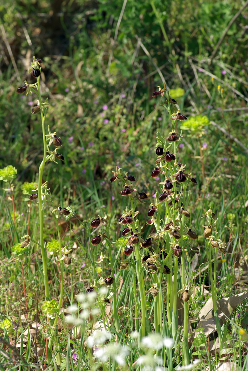 Early Ophrys not flowering after the end of April. Maybe for this reason it was neglected until recently in north-west Greece. In 2007 it was described as an endemic to Albania but apparently exists at the border regions of Epirus, especially at Zagoria. Bicoloured lateral sepals, relatively long petals, small, back-purplish labellum, with a length around 1cm, globular to trapezoid, without the characteristic for Ophrys mammosa, "mammosities" at the lip base, with strong peripheral pilosity which sometimes reminds the Ophrys incubacea of central Mediterranean and a macula design sometimes complex, sometimes in the form of a simple "H". It differs from Ophrys epirotica in the darker flower colors and the much earlier flowering time and from Ophrys mamosa, in the small and hairy labellum.
