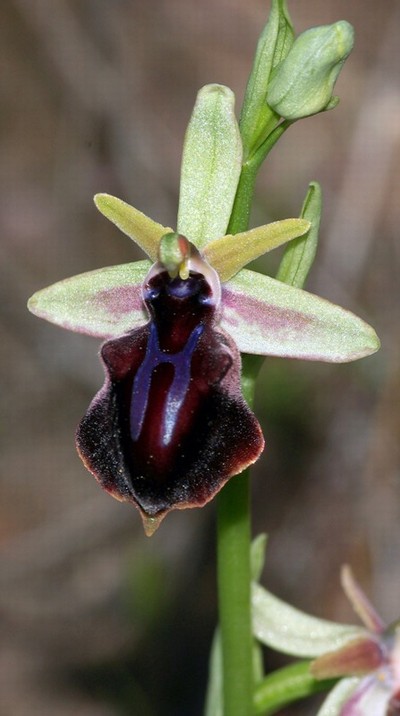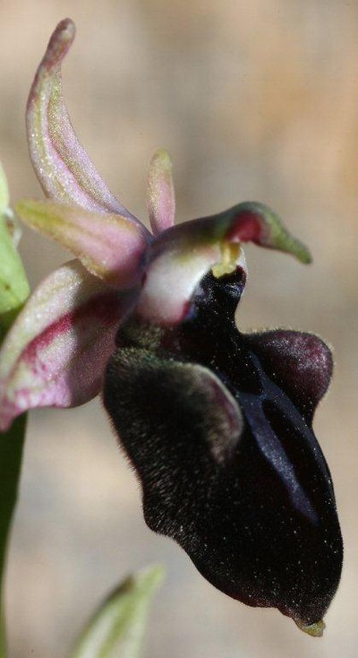 Ophrys mammosa subsp. falsomammosa B.Baumann & H.Baumann, 2005 Description: Ophrys doerfleri was described in the year 1925 by the German botanist H. Fleischmann. He found the plant on the little island Gavdos (near Crete) and the following years it was erroneously postulated that Fleischmann's discovery concerned Ophrys ariadne or Ophrys cretica. Dr Horst Kretzschmar and Ralf Jahn were the first to realize that the Ophrys mammosa from Crete were different than the rest from other areas of Greece. After this, Helmut Presser, in one of his recent articles (Jour. Eur. Orch. 38: 501 – 518. 2006), showed that Fleischmann's reference concerned these particular plants, that until now were classified as Ophrys mammosa from Crete, and not Ophrys cretica or Ophrys ariadnae. Indeed, Ophrys mammosa is an early flowering plant, while Ophrys doerfleri is rather late and it is a little smaller in all parts. There are also other differences in the flowers: Most of the Ophrys doerfleri individuals show another shape of the labellum which is "pinched" in the lower part, reminding a bird's beak. About 20% to 30% show petals and sepals coloured, often pure pink what you can see never or extremly rare at Ophrys mammosa. The connective is always clearly longer than Ophrys mammosa's. It seems that Ophrys doerfleri is related to Ophrys morio (transhyrcana). Some plants remind Ophrys spruneri with entire lip, due to the colored perigon and the wide lib base.