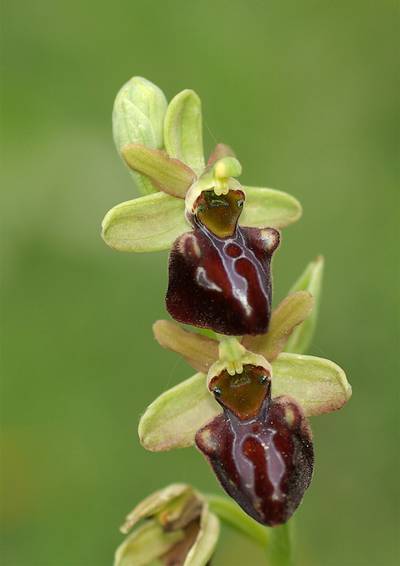 a generally lighter – brownish lip color. Its lip is much smaller. Ophrys
