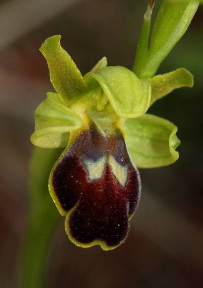 Late flowering Ophrys which was found in several sites on Crete, as in Spili in Zaros, in Asteroussia and Thripti mountains. Compared to Ophrys cressa, it has a longer lip (12,3-14,1 mm versus 10-11mm of Ophrys cressa) and more flowers (from 2 to 8). The stem is usually tall and the flowers are flat compared to Ophrys creberrima. Usually they bear a wide yellow margin. The coloration of the lip varies from brown to black. The speculum is separated by a distinct central, longitudinal groove. Generally it looks like a late flowering Ophrys creberrima with a more flat lip. When it occurs together with Ophrys creberrima, flowering of Ophrys phaidra starts when the latter shows just the last flowers. Currently, the pollinator is unknown.